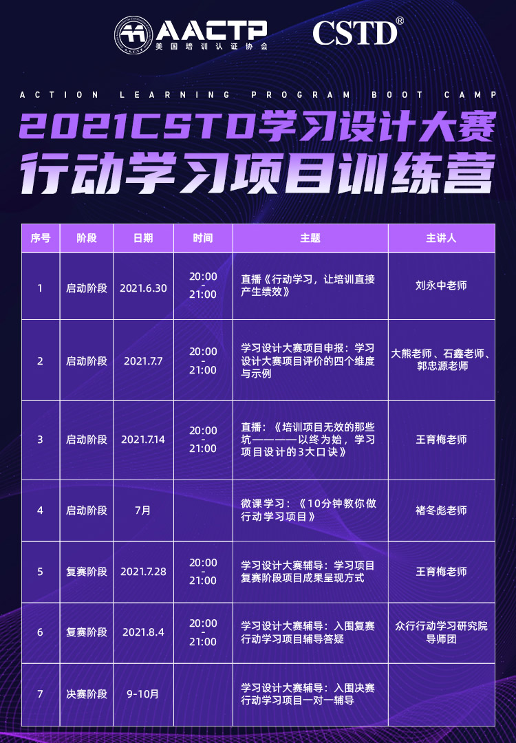 为帮助行动学习参赛项目在材料申报、复赛选拔以及决赛现场能有更好的表现,2021全国学习设计大赛战略九游官网入口的合作伙伴aactp美国培训认证协会,在主办方cstd邀请下,特别为参赛选手精心设计了《2021cstd学习设计大赛-行动学习项目训练营》,同时也欢迎其他类型的报名企业参加!