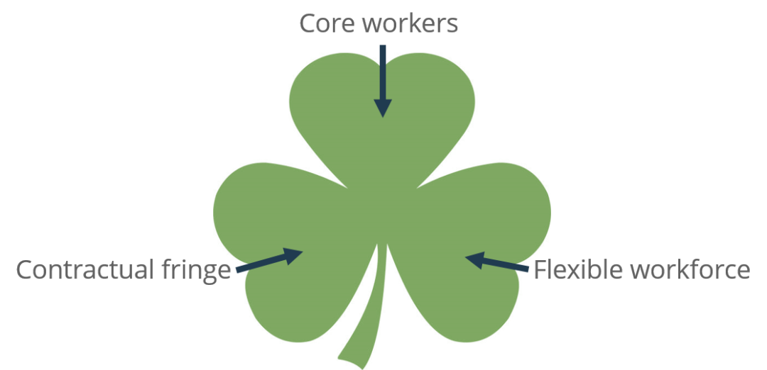 著名的管理学家查尔斯.汉迪曾提出一个三叶草组织(the shamrock organization)模式,他将企业的员工分成三种类型:由技术人员、高级管理人员和专业人才构成的核心叶子,由个体专业人员和合同工构成的第二片叶子,以及由非核心员工和兼职员工构成的边缘叶子。