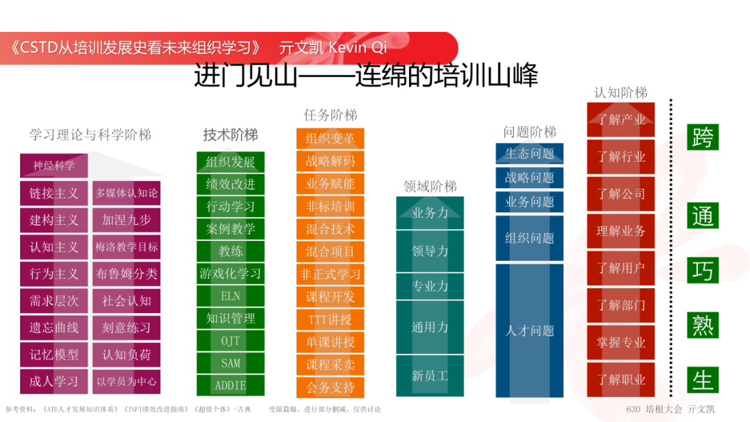 关于培训专业的技术进阶体系,我们刚才梳理了绿色阶梯部分——从基础的教学设计(id)到组织成长技术(ogt),再到绩效改进、教练技术直至组织发展(od),这五个层级构成专业纵深。但完整的知识版图远不止于此,认知科学、问题诊断、领域专精、学习工程等维度各自形成独立的知识峰峦。