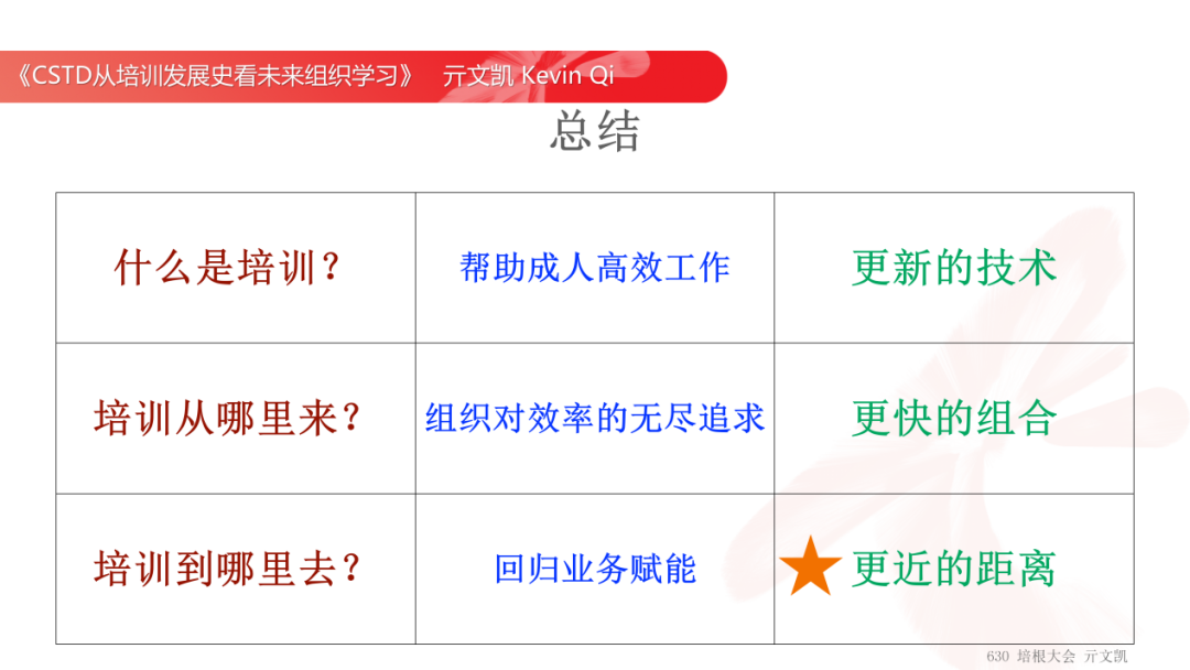 1.什么是培训?——帮助成人高效“工作”;2.培训从哪里来?——组织对“效率”的无尽追求;3.培训到哪里去?——来源于商业,回归于业务。