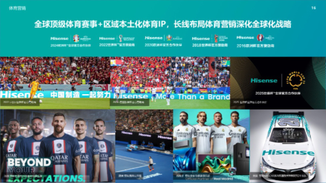 ●渠道选择:根据目标人群偏好布局——海信坚持布局体育营销强化自主品牌建设,先后赞助2016欧洲杯、2018世界杯、2020欧洲杯、2022世界杯、2024欧洲杯等5届世界顶级体育赛事,并成为2025世俱杯全球官方九游官网入口的合作伙伴,品牌影响力乘势而上闪耀世界舞台。