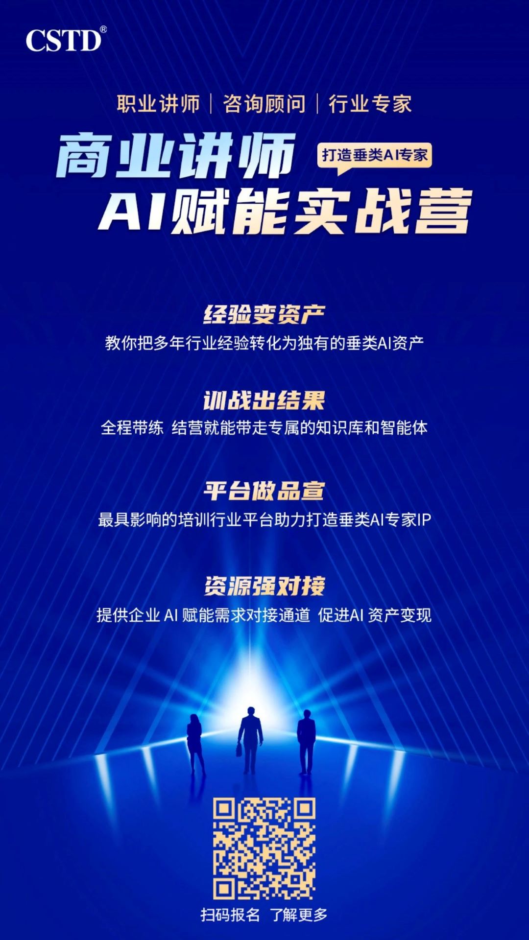 为了帮助商业讲师实现ai转型,cstd隆重推出《商业讲师ai赋能实战营》,通过线上线下的辅导训练,结合磐智ai赋能生态平台,共享10万 企业培训客户资源,助力商业讲师打造垂类ai专家ip,实现领域知识资产的ai商业转化。
