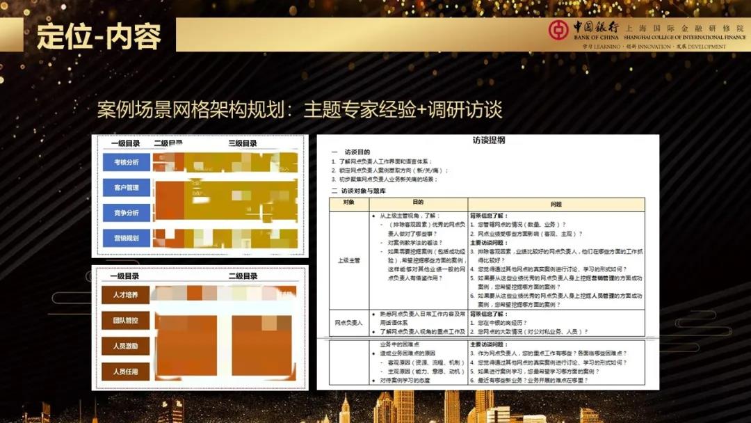 公司先根据网点负责人核心职责进行案例场景网格架构规划,根据调研了解到的业务难点和痛点,通过团队列名、世界咖啡和专家会谈,将主题进一步确认,确认主题价值点的同时,锁定典型的业务场景,再有针对性的筛选案例素材,从中萃取优秀的、可应用的、有实效的普遍性经验,真正达到“用以致学”的目的,最终确立了人员管理和营销管理的四大类案例场景网格。