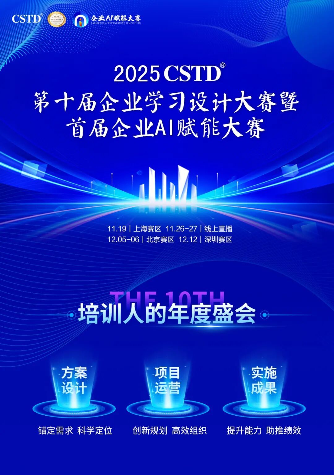 由cstd主办的首届企业ai赋能大赛暨第十届企业学习设计大赛,经过初赛审核和复赛选拔,将于2025年11-12月组织决赛(见下表)。
