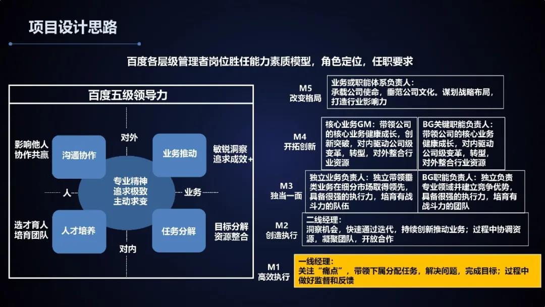项目思路依托于百度五级领导力模型,包含业务推动、任务分解、人才培养、沟通协作和专业精神、追求极致、主动求变五个层面的内容。百度五级领导力对m1到m5五个层次的人员进行了能力岗位要求和任职资格的说明。项目主要围绕m1进行,他们需要培养提升的是高效执行的能力,即能够关注痛点,带领下属分配任务,解决问题,做好监督与反馈,完成目标。除了依托百度五级领导力,项目还通过问卷、bei访谈的方式对储备经理、经理和高级经理进行需求调研,最后整理出该层级需要重点提升的能力。