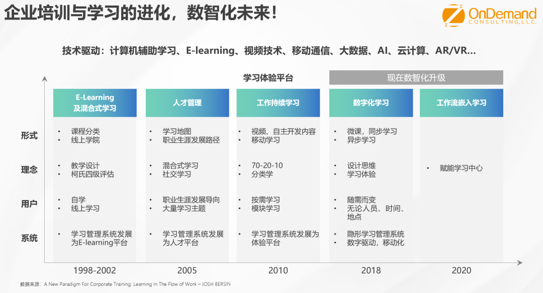 到了2018年,随着人工智能、大数据等技术的进一步成熟,我们进入了数字化学习第二阶段,典型的代表就是微课,学习体验设计思维等。