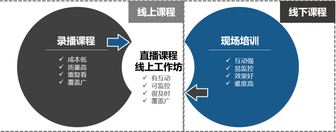 在疫情还没有完全控制的情况下,未来很长一段时间内,会以线上课程为主,线下课程为辅的模式,所以内训师急需要升级的招式包含了4大块:直播课程,微课(录播课程),在岗带教,线上工作坊。