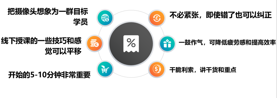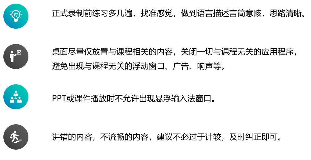 e、语音语速:避免口头语,口误,确保知识点表达流畅。语速不宜过快或过慢,出镜时,卡壳或念错可以立刻停止,进行重录。