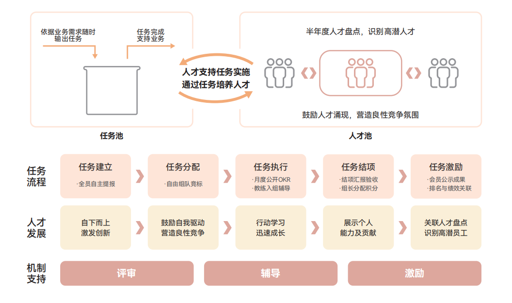 在重点人群激活方面,ita在组织内部推动试行“任务市场”的非常规人与任务匹配方式,打破内部固化的工作和职位一一对应的关系,通过灵活团队的方式激发个人自主创新,打破职能边界,小步快跑产出成果,让个人的能力和贡献被看见。
