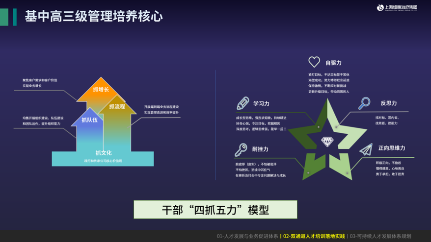 前面提到员工后续会进入两个通道,其中管理通道分为基中高三级。在此基础上,我们构建了三级领导力培养体系,其中最核心的是干部模型。在董事长的带领下,白泽学堂最初经过一个月共创,形成了与上海细胞九游官网入口的文化紧密关联的干部 “四抓五力”模型。