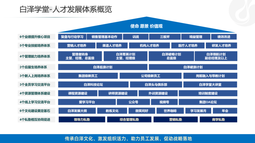 白泽学堂人才发展体系以4大私塾为基础,基于6大文化建设基石,借助资源管理体系和学习平台,为员工打造全生命周期能力提升体系,同时借助业绩提升核心项目,推动整个业务战略的落地。