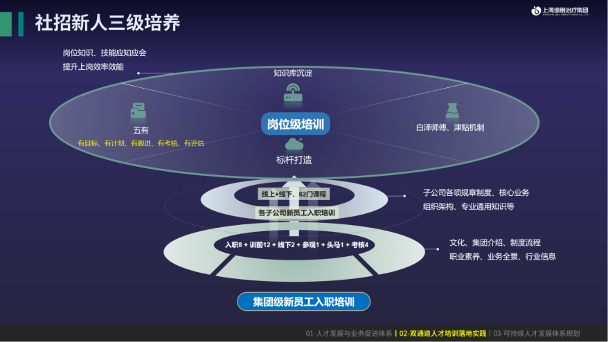 前面提到新员工成长的双通道,那如何发掘他们的潜力,寻找适合的通道就很关键。因此,我们构建了新人三级培训体系。