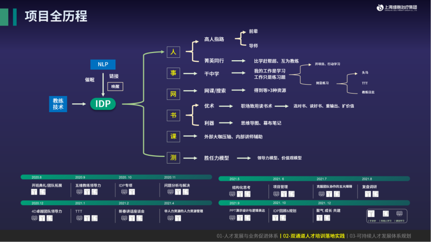 高潜班的目的是为公司战略性人才、经营性人才做储备。项目以idp为主旋律,高度重视学员个人发展,通过大量使用教练技术和nlp(神经语言程序学)等心理学工具,探索学员能力上限,同时结合“721”在“人、事、网、书、课、测”等多个维度配套设计相应内容,帮助学员实现心智模式跃迁。