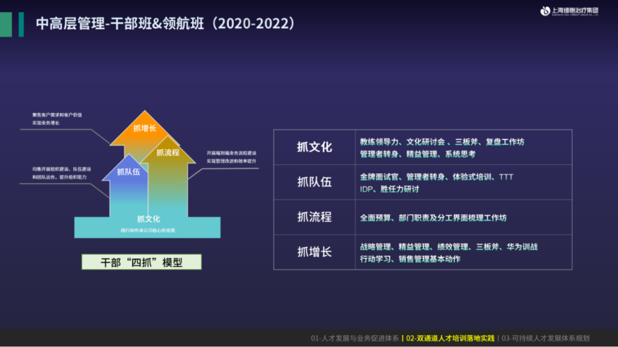 接下来,当这些高潜进入到中高层,包括面对现有中高层,该怎么培养?白泽学堂主要借助干部“四抓”模型,同样是以文化为主旋律,融入一些教练技术,进行设计。但更多不是赋予他们什么新的知识或管理技能,而是让他们有能力打破固有的思维方式,以新的姿态带领公司在新环境下继续乘风破浪。