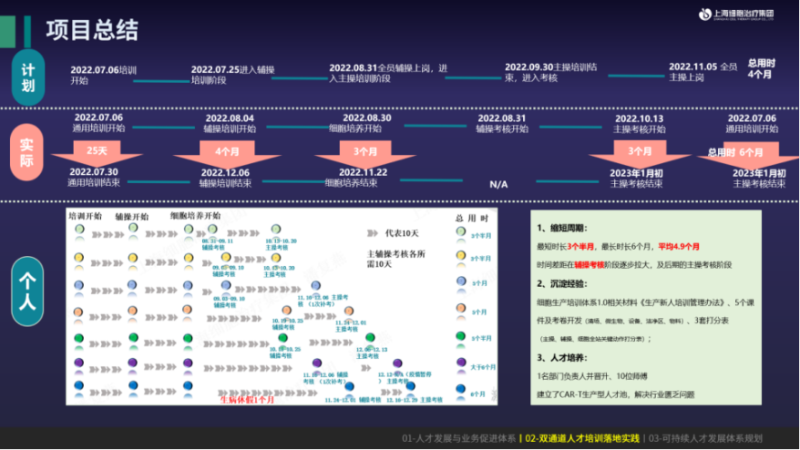 而在技术人才培养方面,我们同样关注优秀标杆、潜力骨干的挖掘。通过培养技术负责人、带教导师,大大压缩技术人才培养周期,我们逐步建立自主的car-t生产型人才池,解决了业务部门面临的行业人才匮乏的痛点。