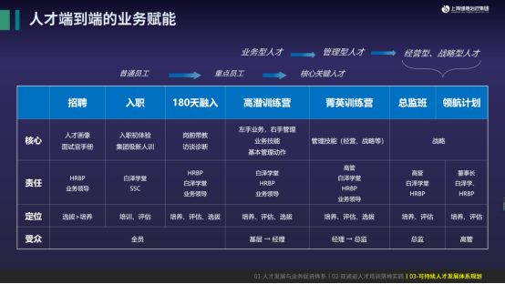 什么叫端到端?就是让一个员工从入职到成为公司关键岗位人员之间,要有一系列连贯、有序的设计。前面提到新人有画像,我们会不断迭代将其作为招聘人才画像的评估标准。而在入职后,我们会提供全周期的成长培养计划,将责任落实到每个关联方,同时明确每个阶段的侧重点,最终帮助他们成长为公司需要的经营型、战略型人才。