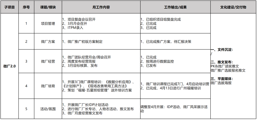 经营指标:3月4个微厂综合得分均达成预定目标,全部获得微厂奖金,综合效率超出目标6%;质量抽检不良率均达标;