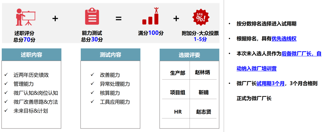选拔采用述职 考试的形式进行选拔,按照分数排名选择进入试用期,根据排名优先选择线体;本次未入选人员作为后备微厂厂长,自动纳入微厂培训营。
