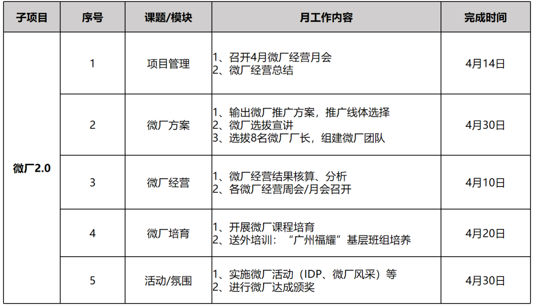 4月将进行微厂第二阶段推广及微厂培育、微厂活动开展,将重心放在微厂的进一步扩大及未来微厂人员团队的建设中。