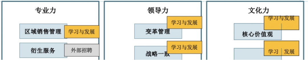 例如,区域销售管理这一组织能力,对其进行分析,就可以先看其组织能力是哪些岗位承接的,进而列出岗位应知应会的能力要求。对应完成后,可以进行细化,将细化的能力转变为学习的项目。