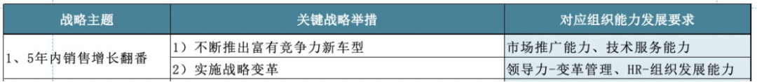 举个例子。我们需要完成推出新产品这一重点任务。此时,主要需要两个组织能力。第一,需要研发出新产品,第二,需要将其推向市场,让更多的人了解并购买,吸引到足够多的客户。也就是说,既需要研发能力,也就是技术服务能力,也需要市场推广能力。对于第二个市场推广能力的关键举措,实施战略变革,对应的能力,从领导力来看,要关注变化,启动变革;对于hr来说,要提高组织发展能力。